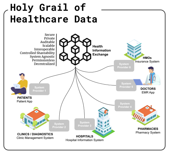 As an important aside, designing and building this decentralized HIE is only a part of the pie, albeit a big one at that. It necessitates looking at the macro view of the ecosystem’s healthcare infrastructure in general. This is to discover if there are other gaps in the processes that need to be addressed. The sector is a deluge of different markets with varying needs resulting in numerous providers creating independent solutions to these differing requirements.
